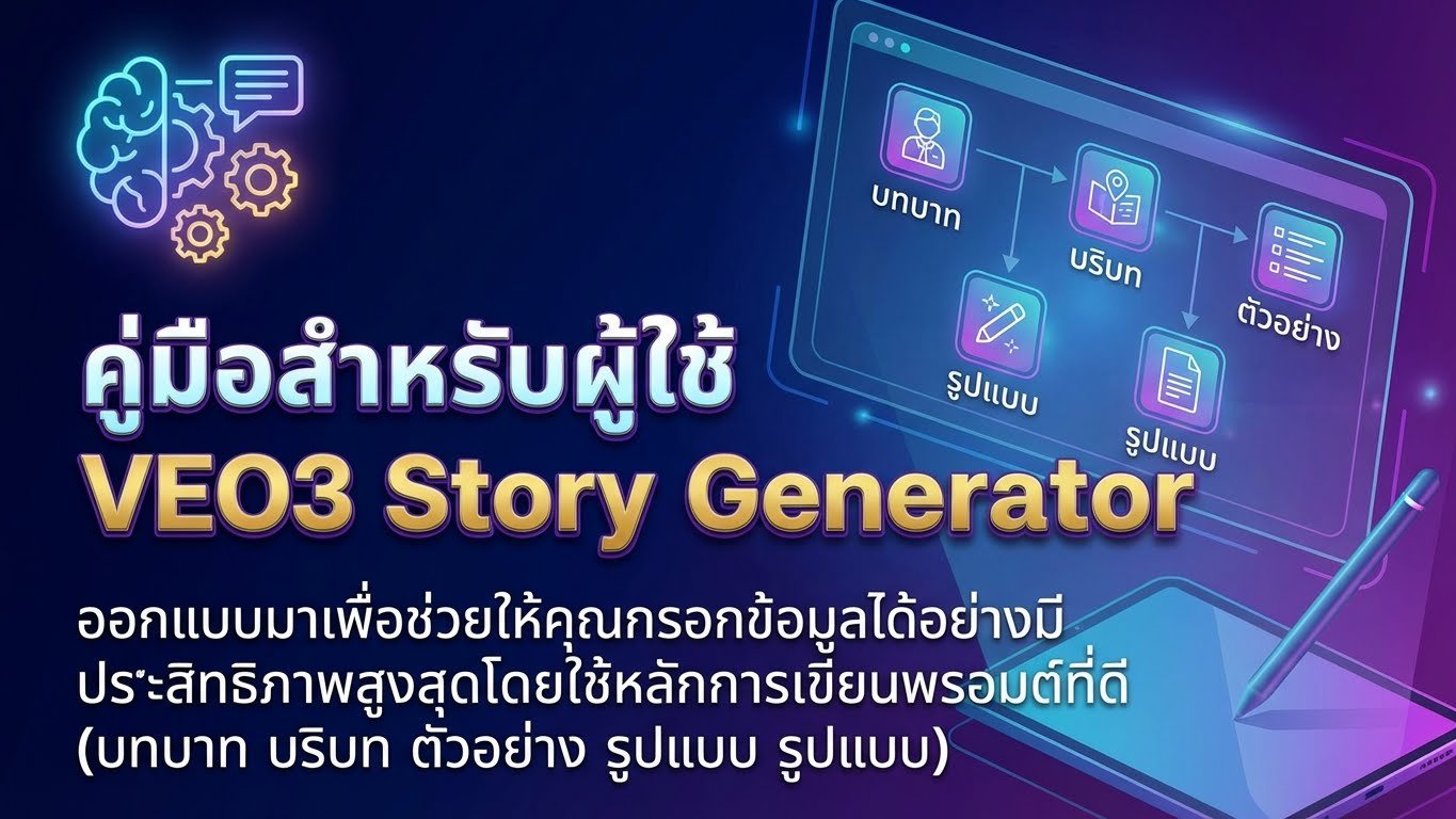 สำหรับผู้ใช้งาน VEO3 Story Generator: คู่มือนี้ออกแบบมาเพื่อให้คุณกรอกข้อมูลได้อย่างมีประสิทธิภาพสูงสุด โดยใช้หลักการเขียน Prompt ที่ดี (Role, Context, Examples, Style, Format)